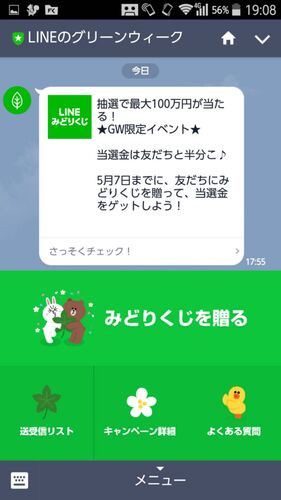 LINEのみどりくじって何だ? 本日、5月1日(月)よりLINEの公式キャンペーン「LINEのグリーンウィーク」が始まっていますね。みどりくじを友だちに送ると最大でなんと!!100万円が当たるというものです。普段、あまりLINEが送られてくることない私のLINE…